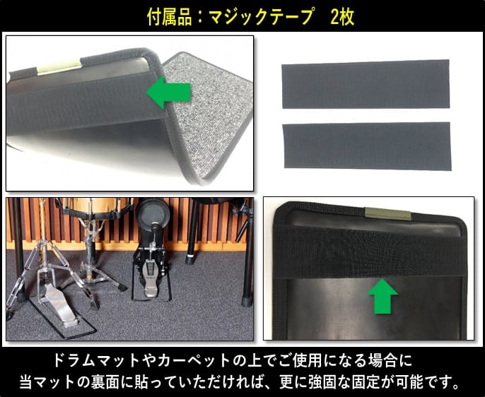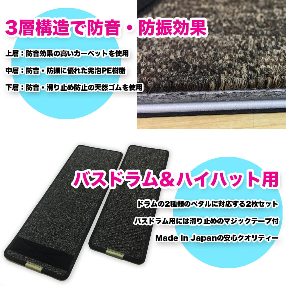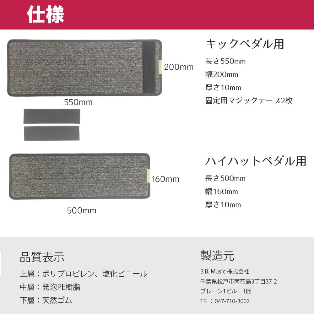 バスドラム用、ハイハット用の2枚1セットでこの価格。価格だけでなく、クオリティーにもこだわったマットです。